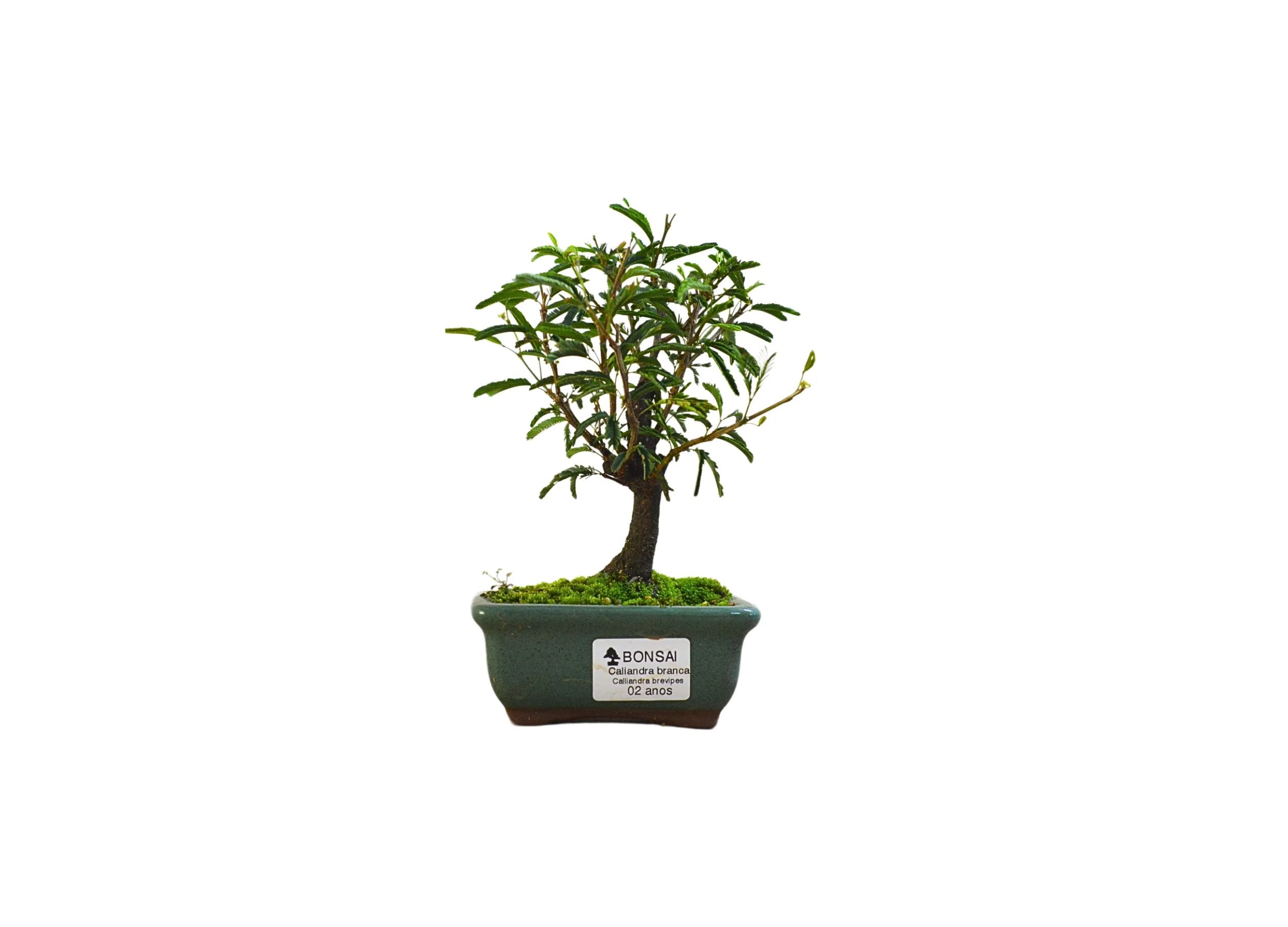 O Bonsai de Caliandra branca, é a planta símbolo do serrado brasileiro. Suas folhas são bi pinadas e as flores são finas e delicadas em forma de pompom que variam entre branco, branca e vermelho. Essas, fecham-se durante a noite por um processo natural da planta, devido a sensibilidade de suas flores. O fechamento das folhas e flores também pode ser causado por desidratação ou mudanças de luminosidade.