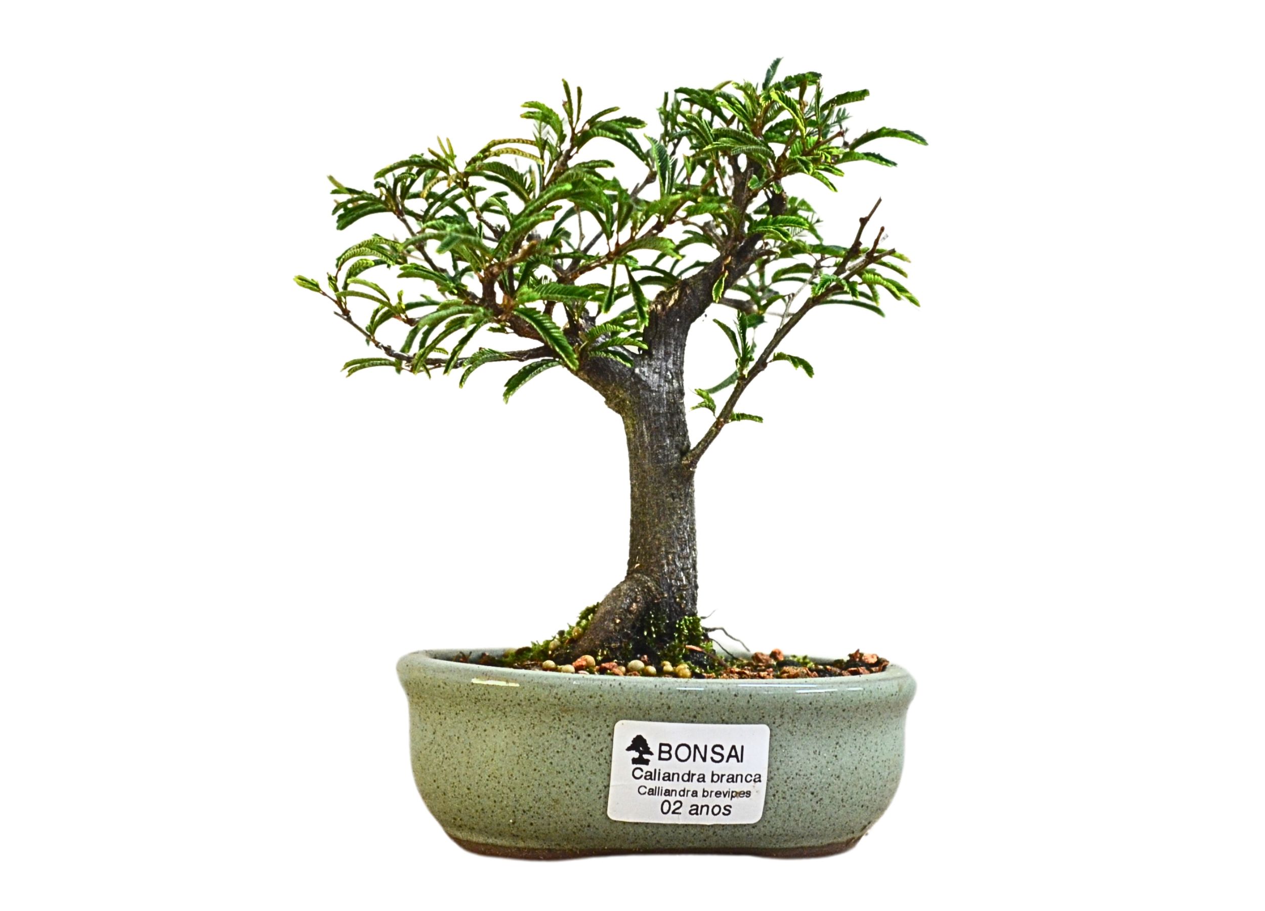 O Bonsai de Caliandra branca, é a planta símbolo do serrado brasileiro. Suas folhas são bi pinadas e as flores são finas e delicadas em forma de pompom que variam entre branco, branca e vermelho. Essas, fecham-se durante a noite por um processo natural da planta, devido a sensibilidade de suas flores. O fechamento das folhas e flores também pode ser causado por desidratação ou mudanças de luminosidade.