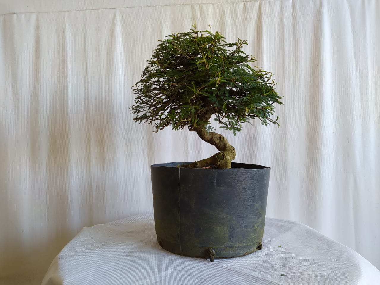 Características: O Bonsai de Caliandra rosa, é a planta símbolo do serrado brasileiro. Suas folhas são bi pinadas e as flores são finas e delicadas em forma de pompom que variam entre branco, rosa e vermelho. Essas, fecham-se durante a noite por um processo natural da planta, devido a sensibilidade de suas flores. O fechamento das folhas e flores também pode ser causado por desidratação ou mudanças de luminosidade. Depois da floração vem os frutos que contém as sementes na forma de vagem. Seu tronco é de coloração cinza e liso.