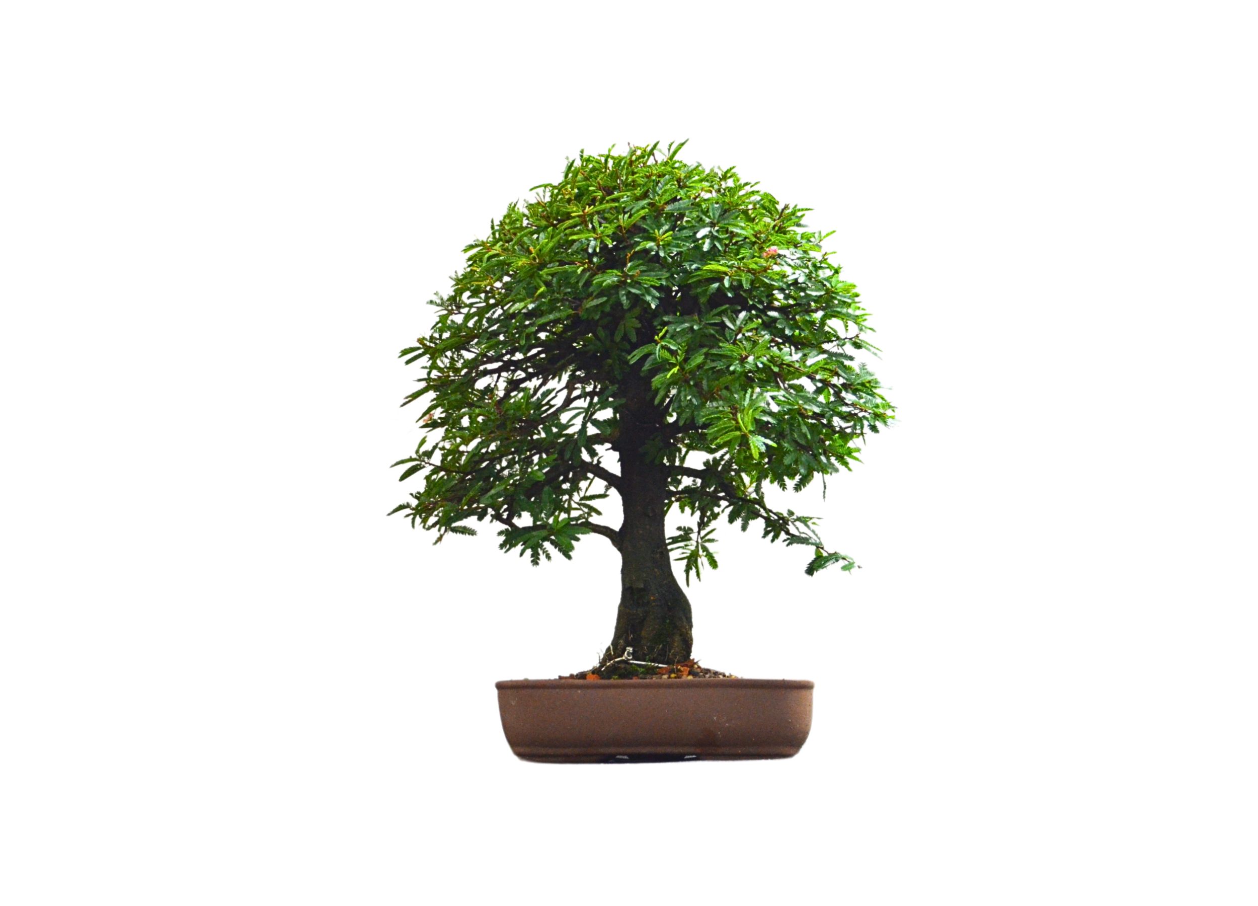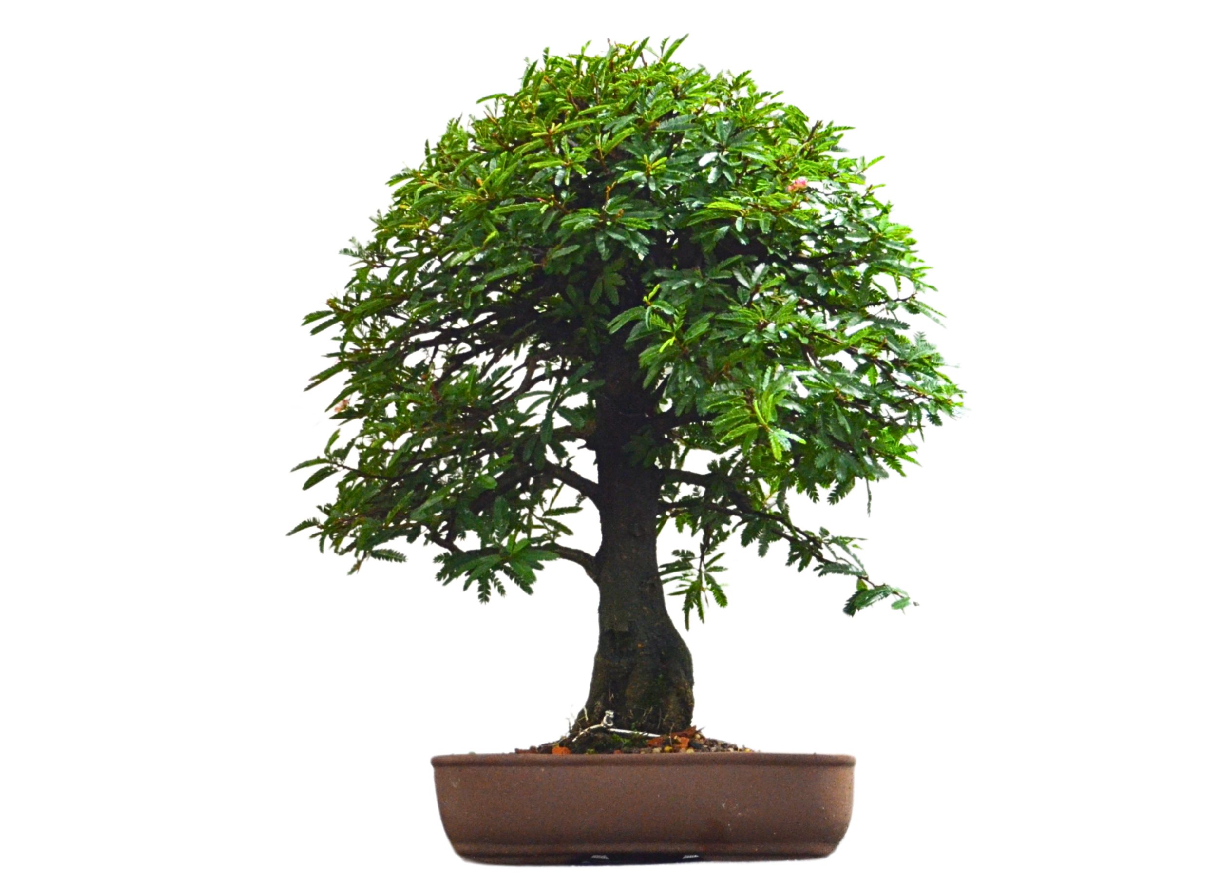 O Bonsai de Caliandra rosa, é a planta símbolo do serrado brasileiro. Suas folhas são bi pinadas e as flores são finas e delicadas em forma de pompom que variam entre branco, rosa e vermelho. Essas, fecham-se durante a noite por um processo natural da planta, devido a sensibilidade de suas flores. O fechamento das folhas e flores também pode ser causado por desidratação ou mudanças de luminosidade.