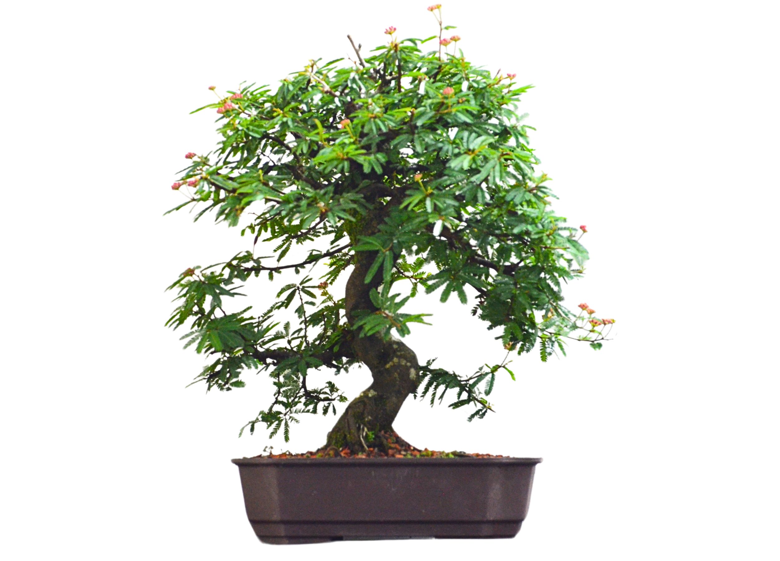 O Bonsai de Caliandra rosa, é a planta símbolo do serrado brasileiro. Suas folhas são bi pinadas e as flores são finas e delicadas em forma de pompom que variam entre branco, rosa e vermelho. Essas, fecham-se durante a noite por um processo natural da planta, devido a sensibilidade de suas flores. O fechamento das folhas e flores também pode ser causado por desidratação ou mudanças de luminosidade.