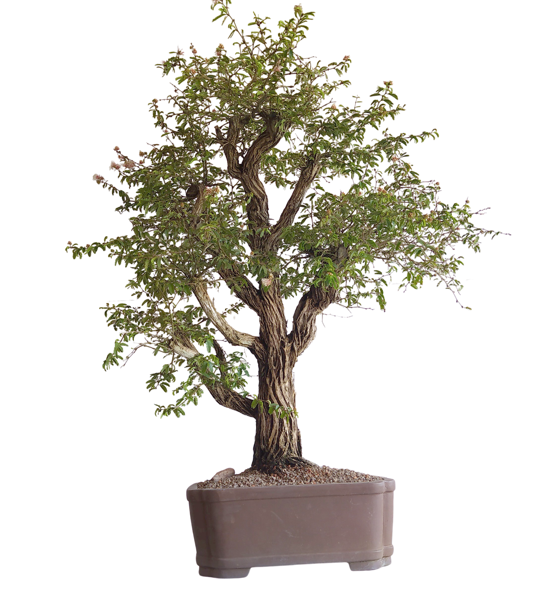O Bonsai Caliandra Spinosa é uma espécie arbustiva nativa da região nordeste do Brasil, especialmente da caatinga. O principal atrativo desta espécie como bonsai é sua casca retorcida que lhe confere um visual de muita idade. Sua floração é um espetáculo criado pela variação na cor das flores que são brancas quando novas e rosadas quando maduras.
