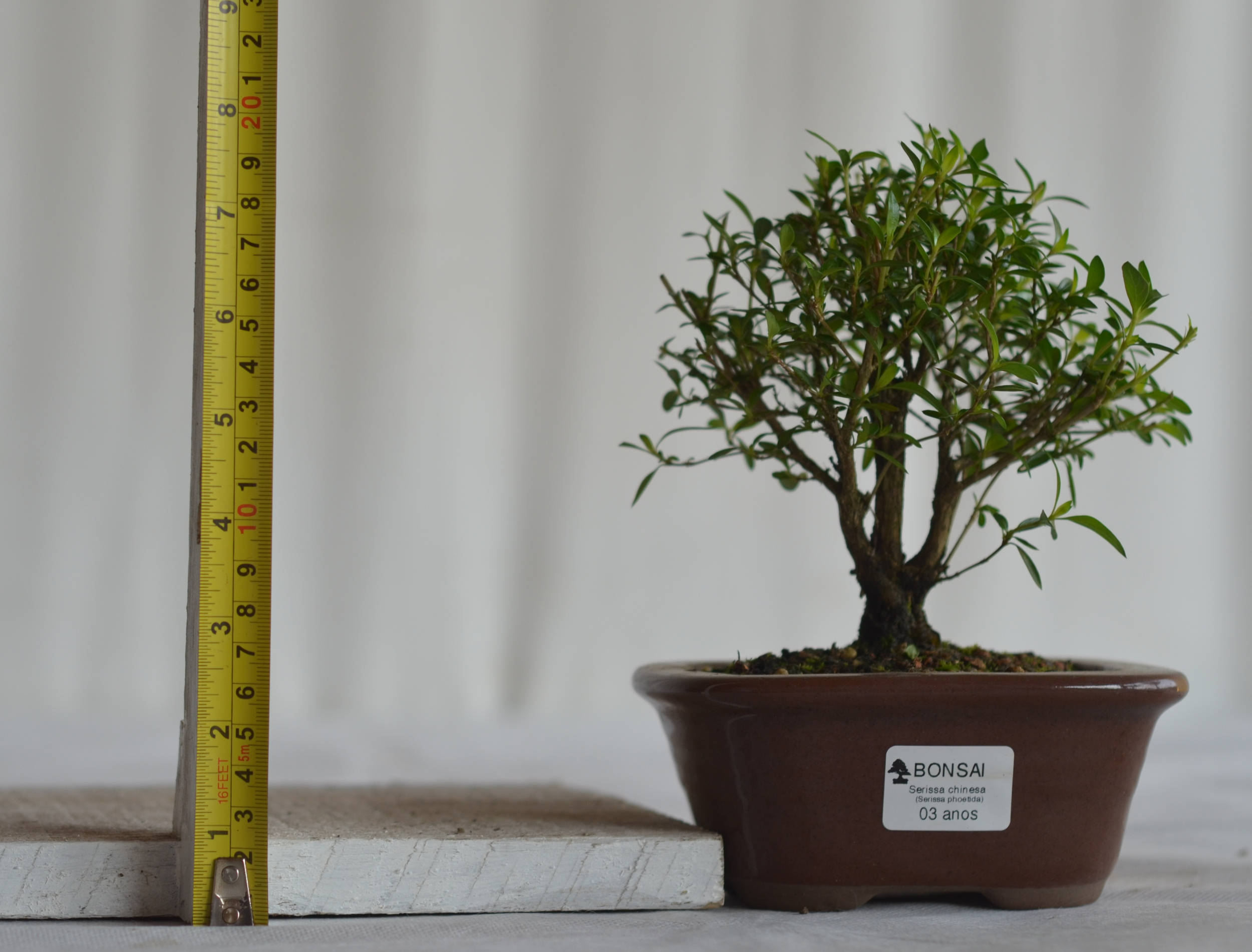 Características: O Bonsai de Serissa chinesa ou phoetida é popularmente chamada de Serissa chinesa. Esta planta é um arbusto. Possui folhas estreitas, verdes e brilhantes. Suas flores são brancas em forma de estrelas que floram durante o ano todo. Seu tronco é marrom-claro.
