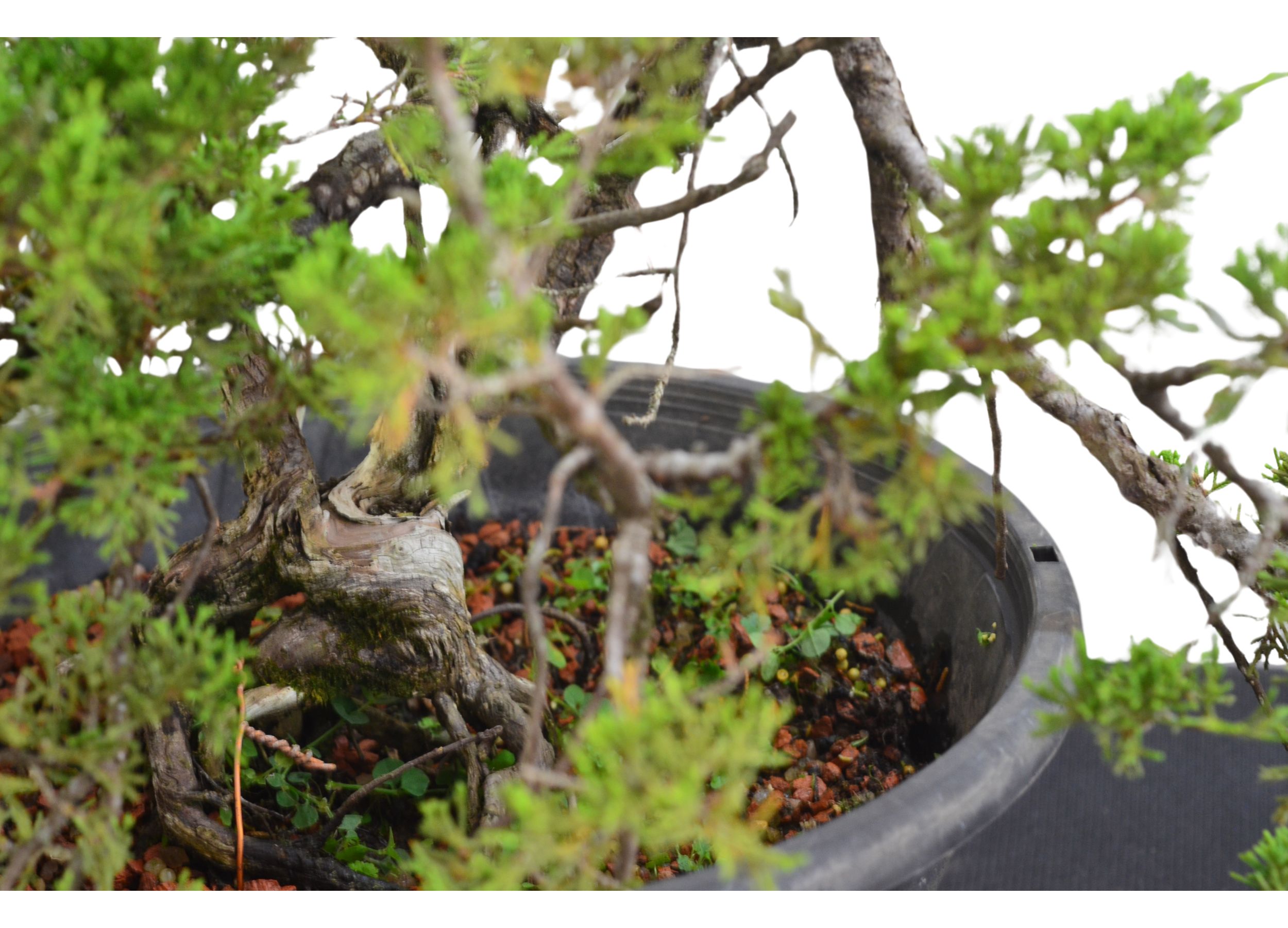 Sua folhagem em formato de escamas aderidas a estrutura e sua fina ramificação formam um conjunto compacto que possibilita o desenvolvimento dos mais diversos estilos e tamanhos de bonsai. Se escovado, o tronco recoberto por casca de cor marrom escura revela um belo tom avermelhado que harmonizará com o verde escuro da folhagem e o branco da madeira.