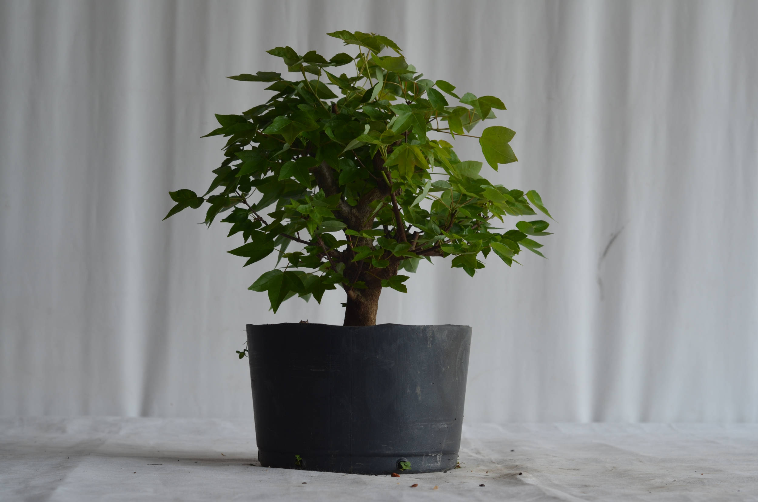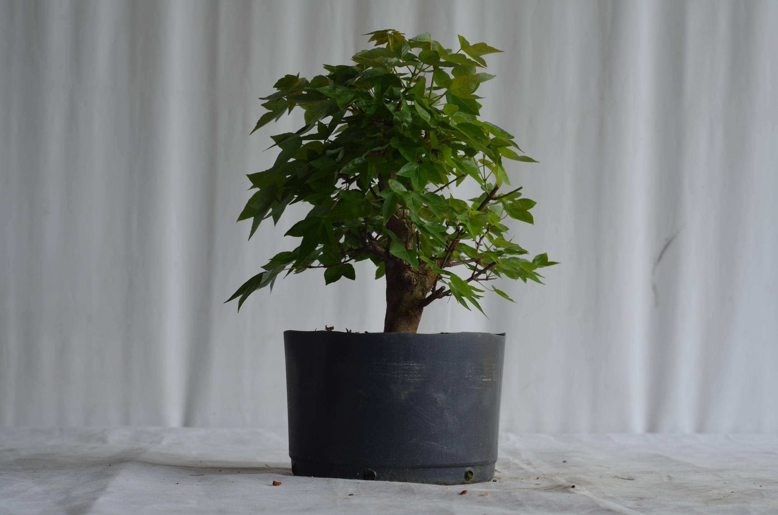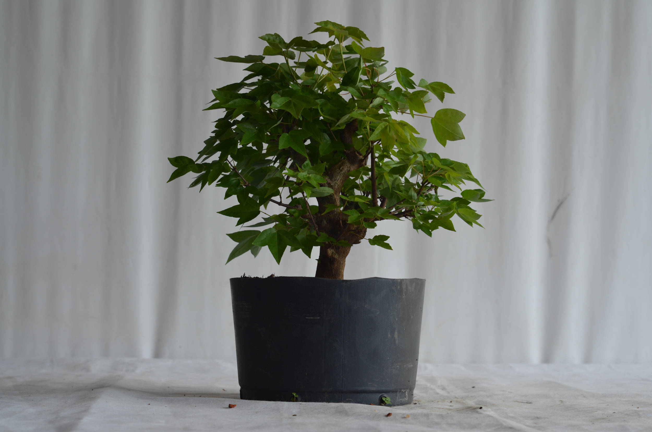 Em relação à poda, devemos esperar que os galhos cresçam a até 5 ou 6 pares de folhas, para então cortar deixando apenas as primeiras 2 folhas. Pode a parte superior da copa de maneira mais intensa para garantir que a brotação se propague nas partes inferiores da planta. Uma técnica muito utilizada no Acer Tridente é a desfolha parcial, deixando apenas os brotos internos, pois assim evitamos que a brotação interna morra, o que facilitará no futuro, quando inevitavelmente teremos que diminuir a copa. Podemos ver essa técnica sendo aplicada na foto a baixo.