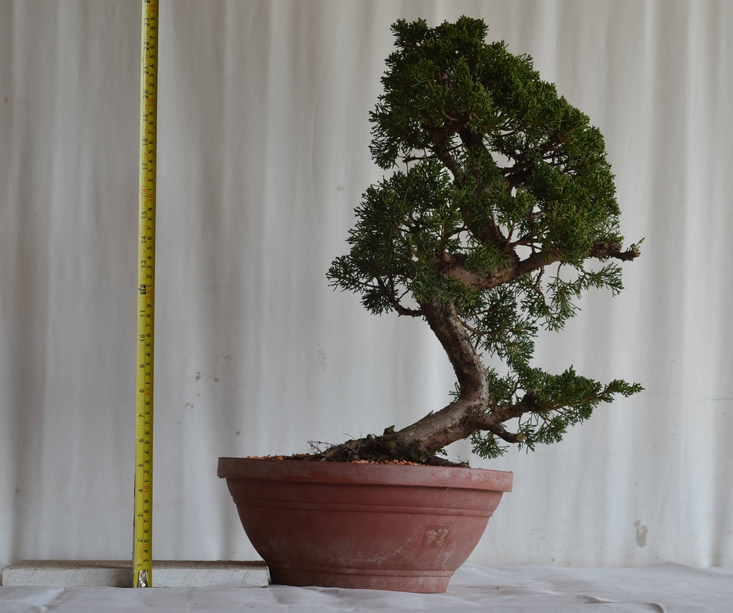 Sua folhagem em formato de escamas aderidas a estrutura e sua fina ramificação formam um conjunto compacto que possibilita o desenvolvimento dos mais diversos estilos e tamanhos de bonsai. Se escovado, o tronco recoberto por casca de cor marrom escura revela um belo tom avermelhado que harmonizará com o verde escuro da folhagem e o branco da madeira.