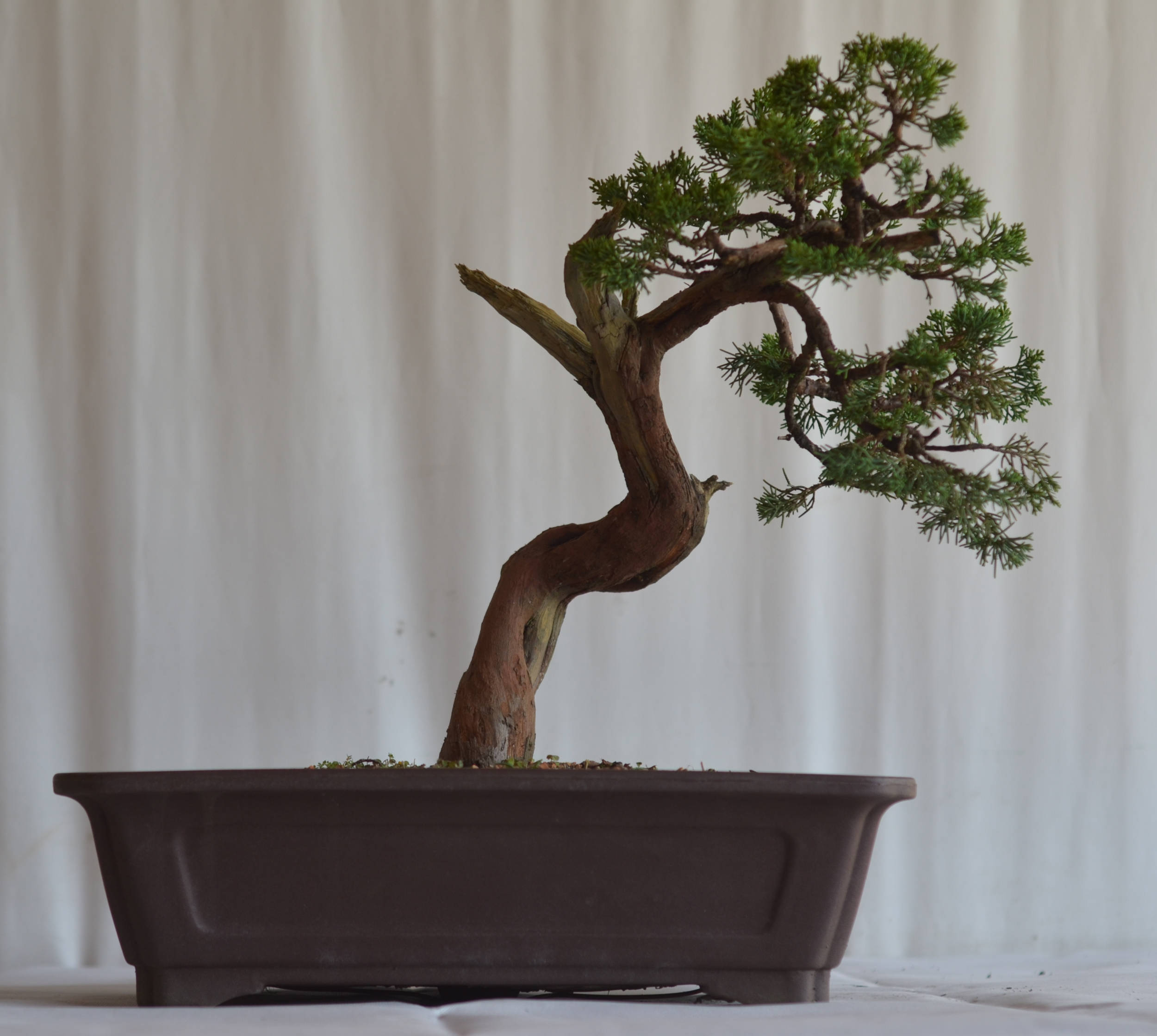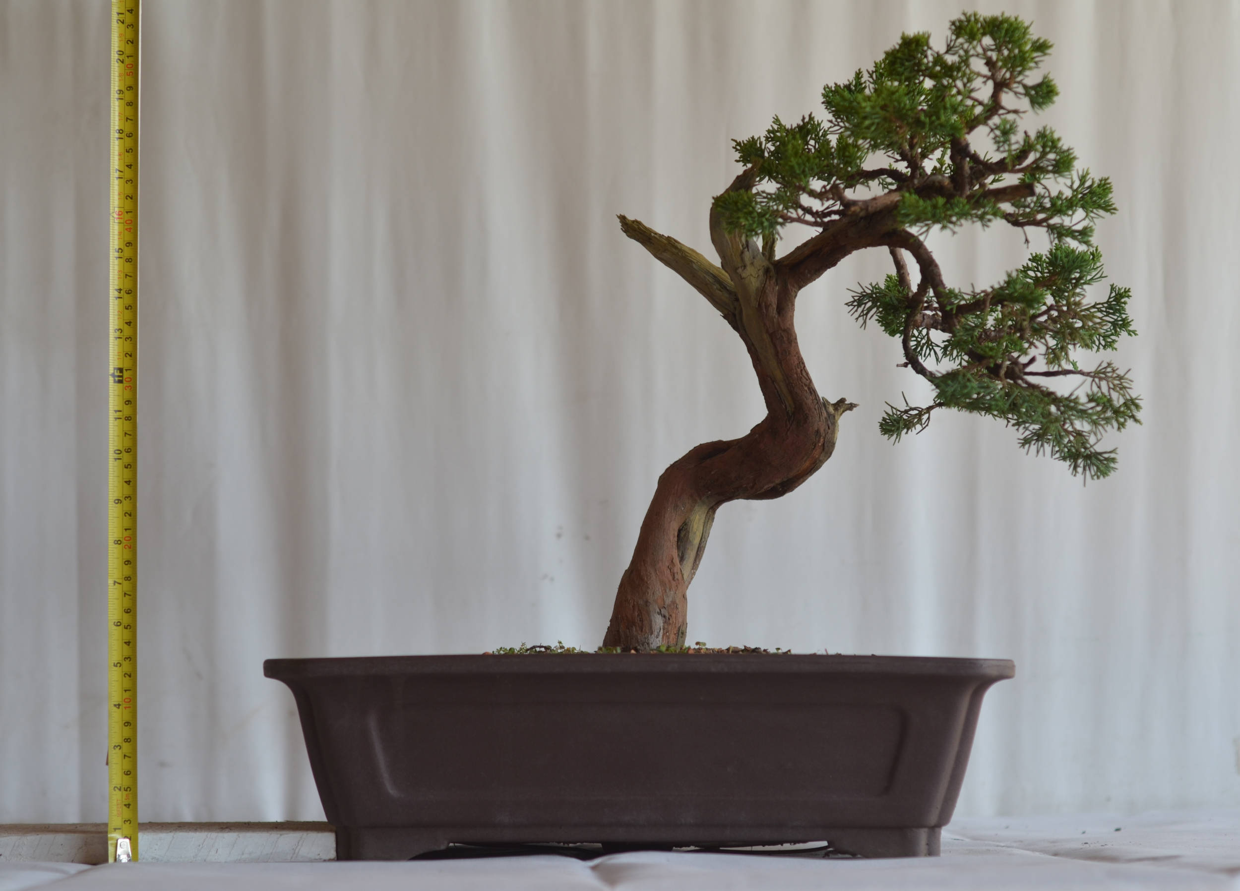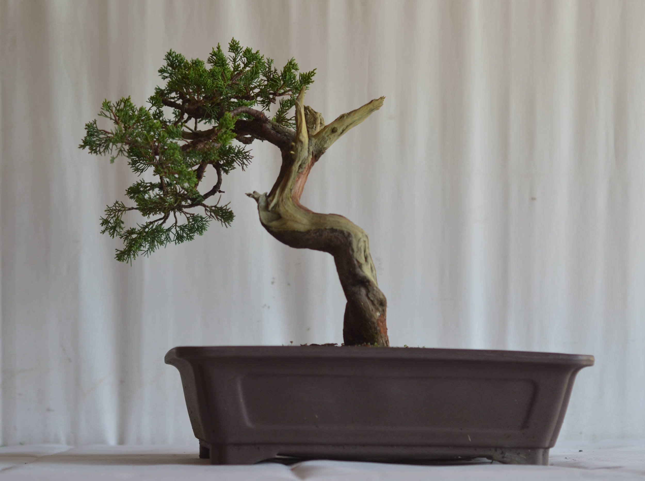 Sua folhagem em formato de escamas aderidas a estrutura e sua fina ramificação formam um conjunto compacto que possibilita o desenvolvimento dos mais diversos estilos e tamanhos de bonsai. Se escovado, o tronco recoberto por casca de cor marrom escura revela um belo tom avermelhado que harmonizará com o verde escuro da folhagem e o branco da madeira.
